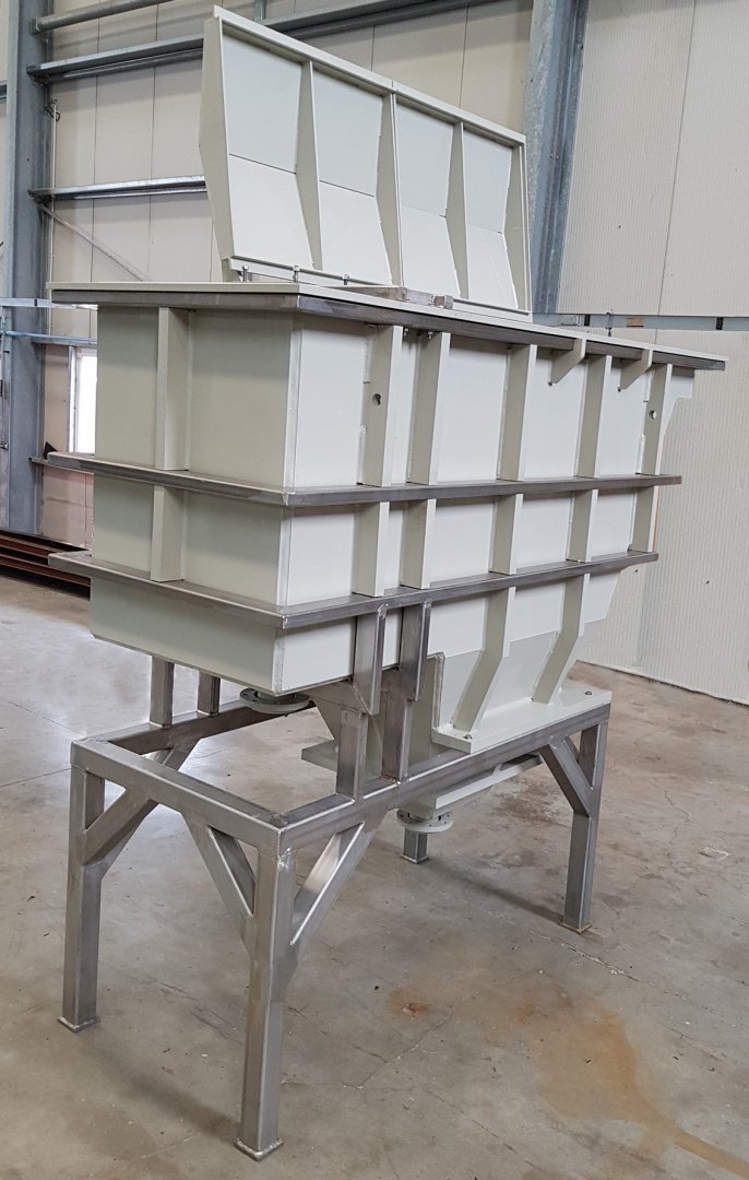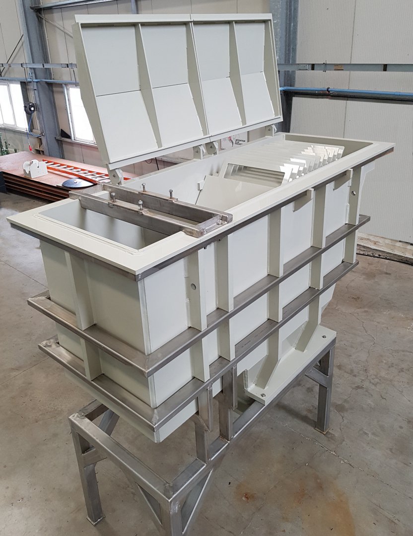 L'évolution des dimensions et des nouvelles contraintes de température (70°C) ont imposés la combinaison d'un châssis en INOX 304 L et d'un bac PPH. Le choix de ces matériaux s'est justifié par le retour d'expérience et l'atmosphère corrosive des produits en présence.